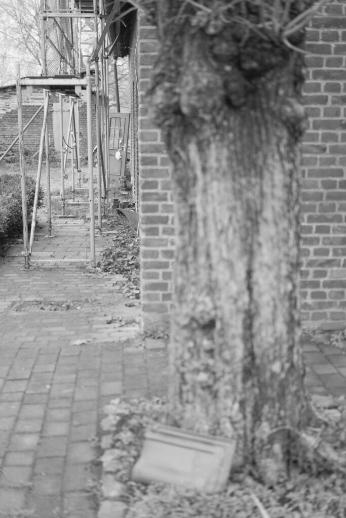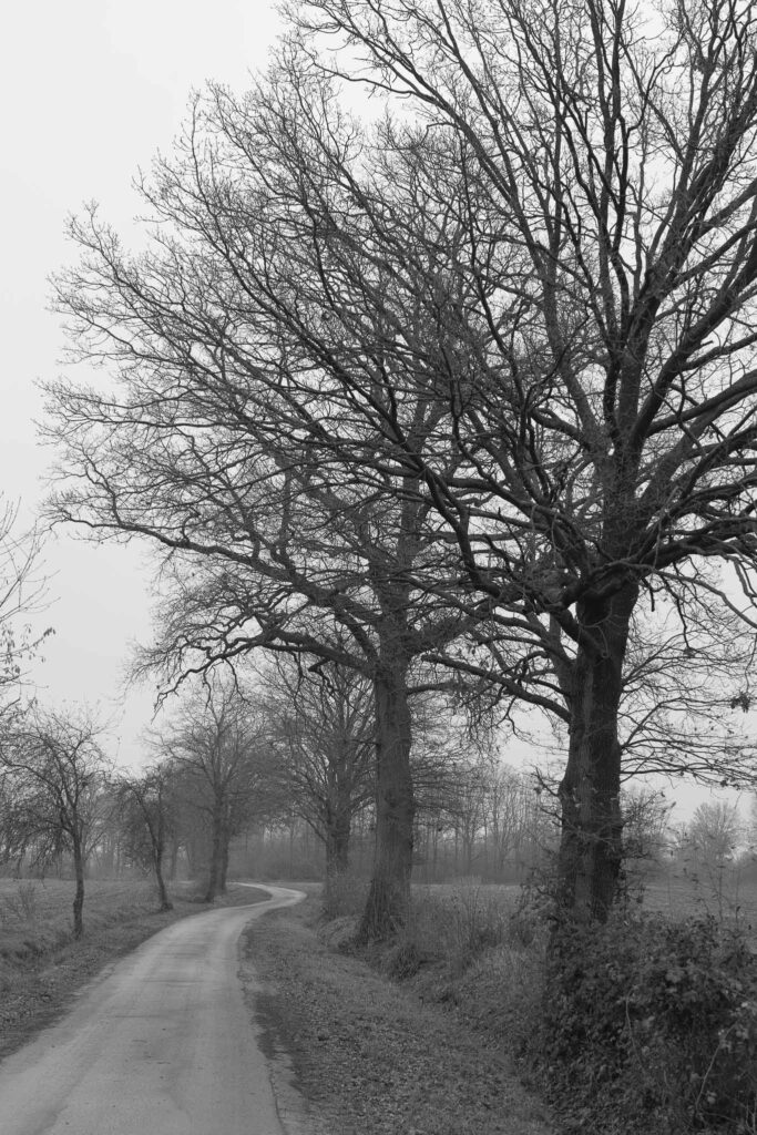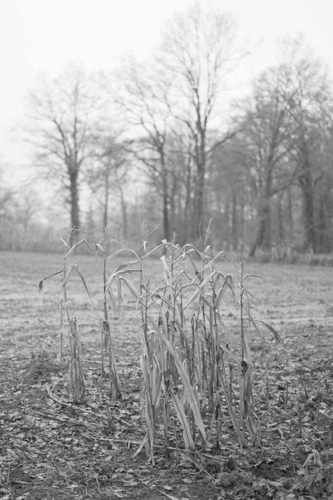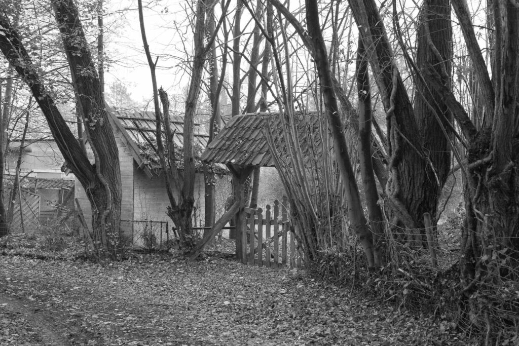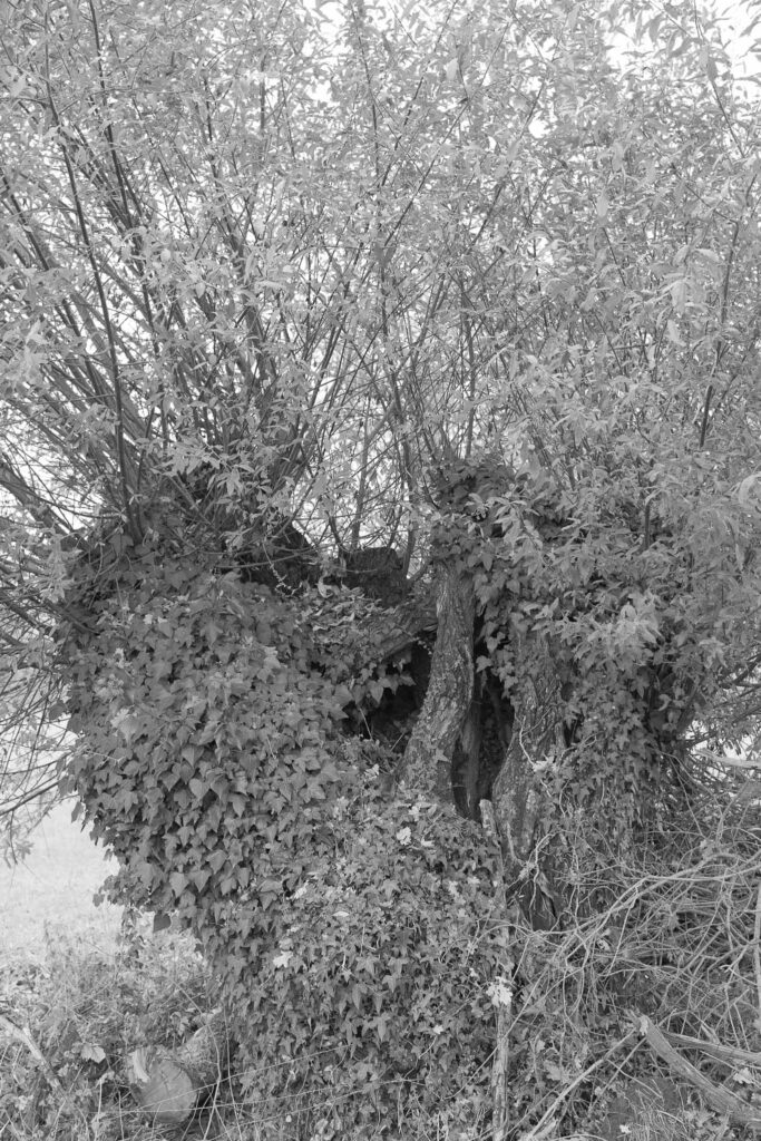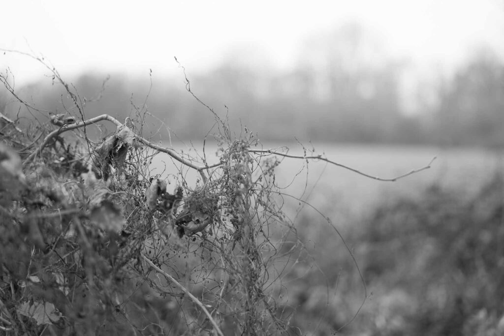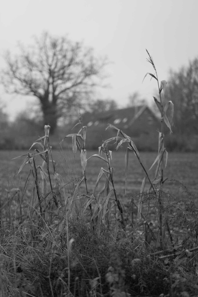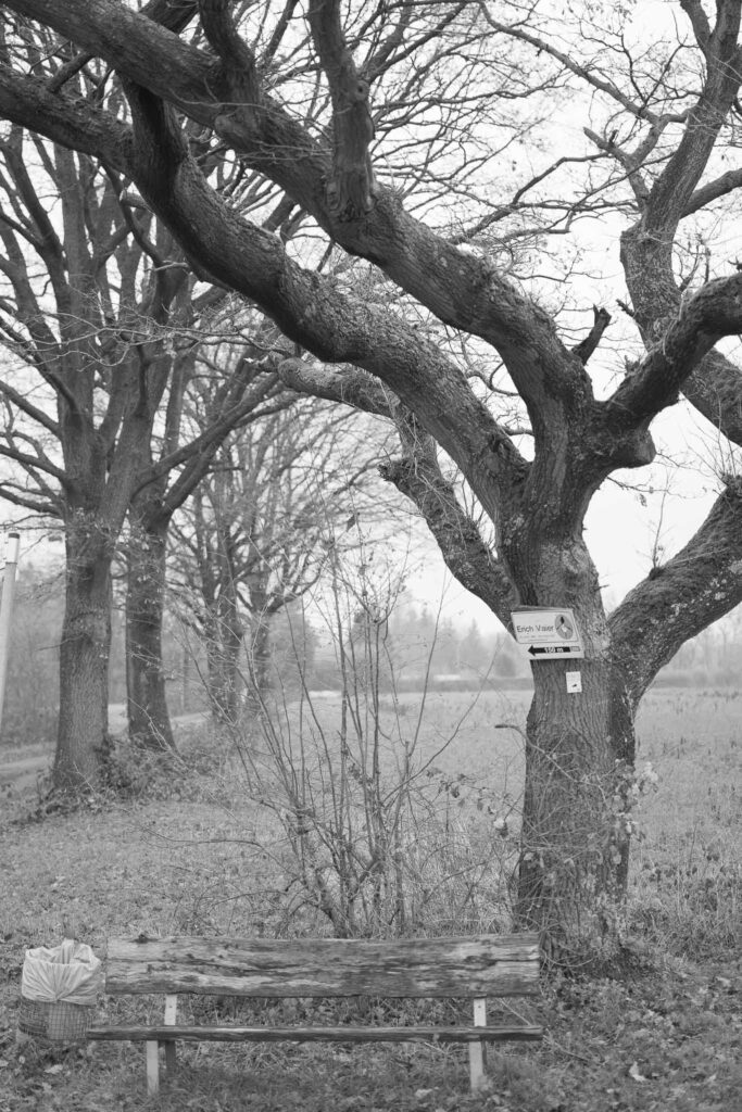 Und jetzt nach der Runde? Komisches Gefühl, weil sie immer dabei sind, aber mit Beginn der Runde kam ich ganz schnell in eine innere Ruhe, die Äußere war hier auf dem Land ja gegeben. Das Wetter war nicht wirklich “fotogen” aber was sollte es. Fast meditativ kam ich schnell in einen fokussierten Kamerablick und es tat richtig gut. Mir kam Eines nach dem Anderen vor die Linse und habe insgesamt 113 mal ausgelöst. Die Menge ist mir nicht bewusst geworden, es fühlte sich wie ein Aufsaugen von Blicken an, aber ich hatte trotzdem das Gefühl, abgeschaltet zu haben.  So habe ich z.B. erst im nachhinein gemerkt, als eine Mutter mit ihren Kind im Hänger an mir vorbeifuhr, das das ja mal ein Motiv wert gewesen wäre. Aber ich war einfach total Gedankenverloren… Nun wiederholen sich ja die Motive, weil ich oft diese Runde gehe, aber ich hatte mich ja auf sw beschränkt und die 50mm. Und ich habe intuitiv versucht, einen neuen, weiteren Blick auf die Motive zu erhaschen. Ob mir das gelungen ist? Na, seht selbst. Was mir allerdings aufgefallen ist: mit sw funktioniert es bei mir eigentlich gut, kenn das ja von früher, aber oft dachte ich: hier noch ein bisschen Kontrast, hier eine kleine Vignette, oder das Grün neben dem Laub kommt nicht so gut rüber etc. Sprich, ich würde gerne doch noch die Bilder bearbeiten, aber es ist wie es ist, habe es so gewollt und nun kommen diese Bilder so wie aus der Kamera. In ein paar Tagen werde ich mich nochmal an die Raws setzen und mal schauen, was die Bilder dann mit mir machen. Das Hintertürchen ist geöffnet…